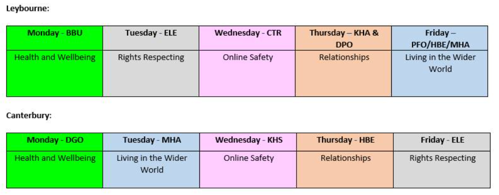 PSHE topics are also discussed in breakfast every morning. The below schedule highlights the topic that pupils will discuss.